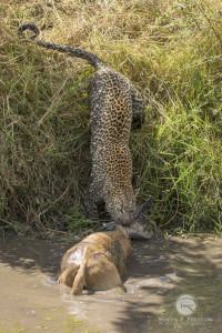 The reedbuck fought the fight. At times it was quiet then it would get a burst of life and writhe around in the water trying to escape. The reedbuck screamed loud and pitifully. The efforts were futile against the power of this leopards bite.